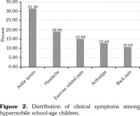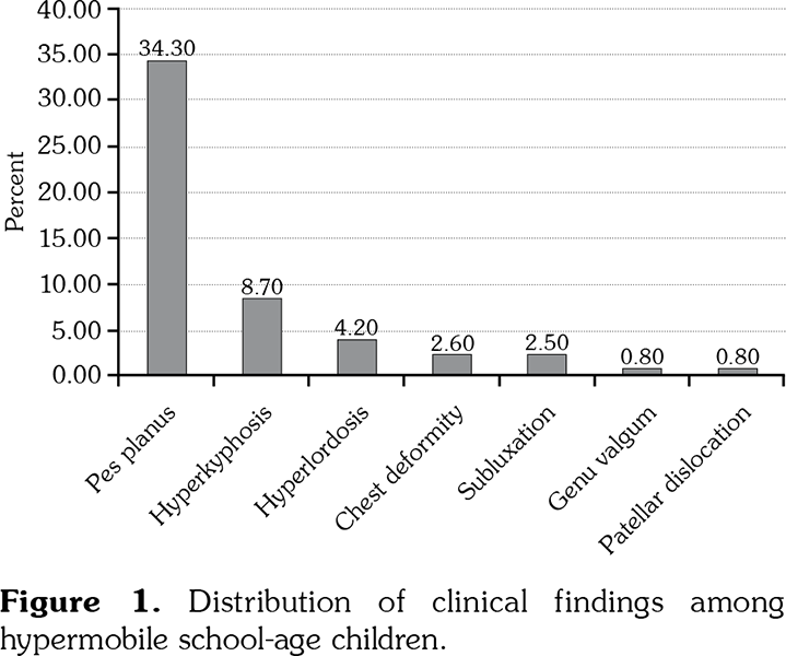 This study has some limitations. We did not assess the musculoskeletal pain or findings undertaken by non-hypermobile children. Therefore, prospective follow-up studies comparing hypermobile and non-hypermobile children are needed to answer the question of whether GJH can increase the risk of future musculoskeletal symptoms. Also, the lack of data in the current study regarding the types of activities children were participating in and injury-related versus non-injury-related sprain limit the clinical significance of the findings. Interestingly, headache was the second most common symptom after ankle sprain. It was caused by servicogenic origin resulting from excessive intersegmental vertebral motion or by the spontaneous intracranial hypotension arising from the leakage from dural membranes fragility or by the involvement of temporalis muscles in temporomandibular dysfunction resulting in tension type headache with pericranial tenderness.(27-29) Likewise, Butt et al.(30) found that headache was the most common non-specific symptom in hypermobile individuals.