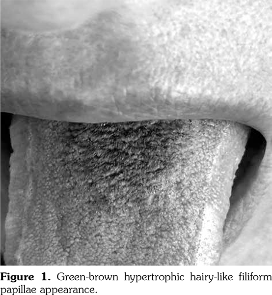 Black hairy tongue (BHT) is a benign disorder characterized with hypertrophy and elongation of papillae with hairy-like appearance on the dorsal surface of the tongue.(1) Although the most common discoloration of the tongue is black, hairy tongue may also present in brown, yellow, and green colors.(2) There is an abnormal keratin accumulation in filiform papillae caused by defective desquamation which prevents normal debridement of papillae, leading to accumulation of debris, bacteria, and fungi.(3) The etiology of hairy tongue has not been fully understood. Male sex, older age, smoking, alcohol use, poor oral hygiene, and patients on certain drugs are at risk for BHT.(2) Although hairy tongue is mostly asymptomatic, rarely nausea, halitosis, and taste changes can be seen.(4) Diagnosis of BHT principally relies on visual inspection of the tongue and inspection of the elongated and discolored filiform papillae. Oral hairy leukoplakia, “pseudo- hairy tongue”, pigmented fungiform papillae of the tongue, acanthosis nigricans, congenital lingual melanotic macules, congenital melanocytic nevi, premalignant leukoplakia, squamous cell carcinoma, and hypertrophic herpes simplex virus (HSV) infection should be considered in differential diagnosis.(5)