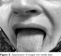 A 60-year-old female patient diagnosed with polymyalgia rheumatica admitted to our rheumatology clinic. She was prescribed 10 mg/day prednisolone two months before. She discontinued prednisolone due to relief from symptoms; however, her complaint restarted after discontinuation. She was prescribed 10 mg/day prednisolone again. One week later, she admitted with an asymptomatic green-brown discoloration of the tongue. She did not have pain, metallic taste, dysgeusia, burning mouth, or halitosis. She did not have xerostomia. She was non- alcoholic and non-smoker, with no history of drug intake except prednisolone. She reported that similar color change and appearance developed in previous oral systemic glucocorticoid use. The previous appearance developed after 10 days of glucocorticoid use and hairy-like appearance resolved after two weeks. She did not brush her tongue or use any topical ointment for the first appearance. There were green-brown hairy-like projections on the middle and posterior one-thirds of the dorsal surface of the tongue (Figure 1). There was no discoloration on the buccal mucosa and palpable cervical lymph node. Serology for hepatitis and human immunodeficiency virus were negative. Fungal culture was negative. Based on clinical findings, diagnosis of hairy tongue was established. Prednisolone was discontinued. She was recommended to clean her tongue with a soft toothbrush twice daily and give more importance to oral hygiene. Two weeks later, we observed that the hairy coating on the tongue was decreased significantly (Figure 2) and it disappeared completely at the third week. A written informed consent was obtained from the patient.