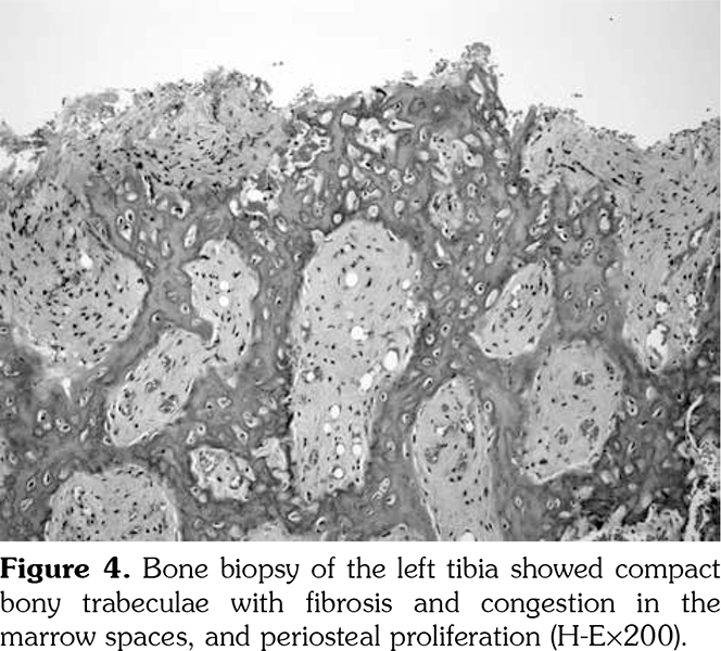 He was started on non-steroidal antiinflammatory drugs (NSAIDs), naproxen, and elemental iron. His fever and joint pain subsided after two weeks. However, two weeks later, he started complaining of pain in the lower end of the left tibia. Three-phase bone scan showed increased tracer uptake in the distal metaphysis of the left tibia in all phases, including flow phase, blood pool, and delayed phase (Figure 2). Plain X-ray of the left leg revealed a well-defined lucency in the distal part of tibial diaphysis with peripheral sclerosis (Figure 3a). Magnetic resonance imaging (MRI) of the left leg revealed a lesion in the left distal tibia diaphysis, which appeared as a central hypointensity with a peripheral rim of signal intensity, with enhancement following administration of intravenous contrast medium (Figure 3b-d). Open bone biopsy of the lower end of the left tibia revealed viable compact bony trabeculae with fibrosis and congestion in the marrow spaces. Features were of periosteal proliferation and were consistent with chronic osteomyelitis (Figure 4). Bone aspirate culture was negative.