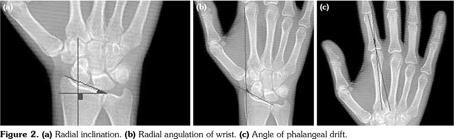 Anteroposterior radiography was performed on both hands of all patients by the same technician using the standard technique. Radial inclination (RI) is the angle between the distal surface and the longitudinal axis of the radius. The normal range of RI specified in the literature is 21° to 25°.[9] Radial angulation of the wrist (RAW) is the angle between the radial corner of the second metacarpal bone and the distal radius surface.[10] The angle of phalangeal drift (APD) is measured at the intersection of the lines along the shafts of the second metacarpal bone and the second proximal phalanx. As APD increases, the ulnar deviation of the fingers increases.[11] The radiographic measurements were repeated three times for each patient and averaged. The measurements of RI, RAW, and APD were shown in Figure 2.