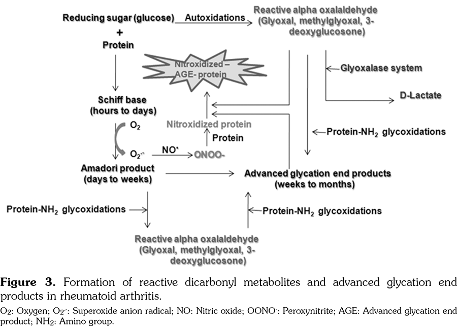 Many studies propose the implications of oxidative and nitrosative stress and production of reactive dicarbonyl species (which ultimately form advanced glycation end products) in the pathogenesis of RA. Oxidative stress is a state in which the dynamic redox balance between oxidants and antioxidants is strongly switched towards oxidative potential leading to interruption of redox signaling and control and/or molecular damage.[10] A parallel process is nitrosative stress which can be defined as the ratio of nitrosants to antioxidants as >1 with the participation of reactive nitrogen species (RNS).[11] Similarly, advanced glycation end products (AGEs) formation and action is another parallel process linked to oxidative and/or nitrosative stress and inflammation.[12]