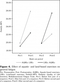 There was a significant decrease in the general fatigue measured by PedsQL-MFS in both AQBEs and LBEs groups (F 3,4=517.6, p<0.001; Wilks’ Λ=0.003, partial η2=0.997). Nevertheless, AQBEs improved the PedsQL-MFS more than LBEs (44.2±2.3, 61.9±3.9, respectively) (p<0.001). Figure 6 demonstrates the PedsQL-MFS changes between both treatments. General fatigue score was not significantly affected according to the sequence of treatment given first (F 1,6=2.1, p=0.2; Wilks’ Λ=0.743, partial η2=0.26).