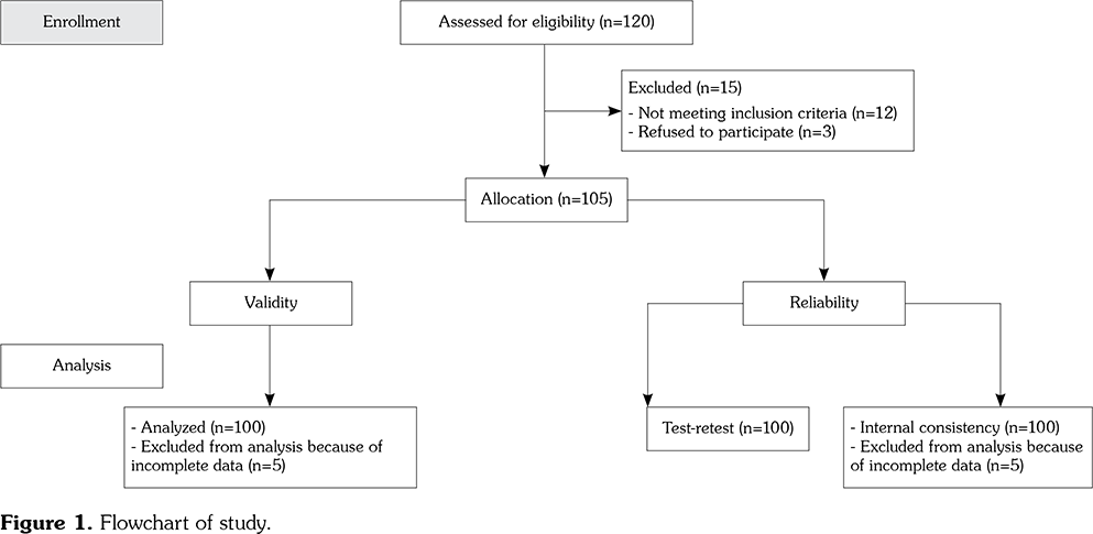 The study included 105 patients who were diagnosed with ax-SpA by rheumatologists according to the ASAS criteria.[3] Five patients who could not complete the questionnaire were excluded (Figure 1). Patients who were unable to speak or understand Turkish, those aged under 18 or over 65 years, those with cognitive impairment, and those who had both ax-SpA and fibromyalgia were excluded. Thus, 100 patients (42 males, 58 females; mean age 40.3±9.1 years; range, 18 to 65 years) answered MSK-HQ-T, Turkish version of BASDAI (BASDAI-T), Turkish version of BASFI (BASFI-T) and Turkish version of SF-36 (SF-36-T). For test-retest reliability, MSK-HQ-T was performed again five-seven days later. Patients answered all questionnaires in the same order and continued to use their general medications between the measurements.