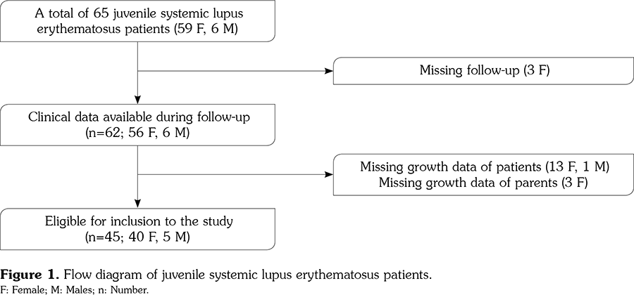This retrospective study was conducted at Çukurova University School of Medicine between June 2018 and December 2018. Medical files of a total of 65 jSLE patients were evaluated. Inclusion criteria were jSLE patients diagnosed according to the revised 1997 classification criteria of American College of Rheumatology[9], followed-up for at least six months between January 2005 and June 2018, and whose anthropometric data were available at baseline and follow-up assessments. Some patients were excluded due to lack of clinical, laboratory, and medication data or growth parameters of patients and parents. The flow diagram of the study was given in Figure 1. Forty-five jSLE patients (5 males, 40 females; mean age 12.3±3.2 years; range 7.1 to 18 years) were finally included. All patients were of Turkish descent. Medical files were retrospectively reviewed for data including sex, age at both disease onset and diagnosis, clinical characteristics, and medication data. Laboratory parameters including C-reactive protein, erythrocyte sedimentation rate, complement levels, and autoantibodies were also noted. The SLE Disease Activity Index 2000 (SLEDAI-2K) was calculated to measure disease activity at last visit.[10] The disease outcome was assessed by utilizing PedSDI at last visit.[7] The study protocol was approved by the Çukurova University School of Medicine Ethics Committee (approval number: 82/32). A written informed consent was obtained from legal guardians of each patient. The study was conducted in accordance with the principles of the Declaration of Helsinki.