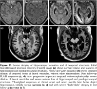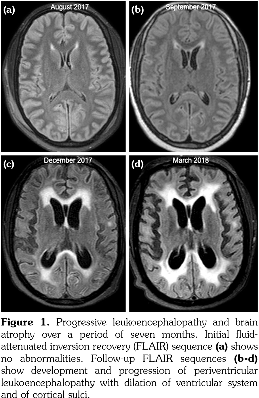 In this article, we report the case of a young female patient previously diagnosed as SLE, who presented with important cognitive decline. A comprehensive diagnostic work-up and follow- up, including high-resolution specific vessel-wall imaging, established the diagnosis of cerebral vasculitis. MRI exams showed abrupt progression from normal brain to extremely severe atrophy in a few months. Rapid progressive cerebral atrophy was already recognized in NPSLE,[3] the novelty of this report being the underlying vasculitis demonstrated on vessel-wall MRI sequences as an underlying mechanism. Our purpose is to describe this form of onset of NPSLE and to make known the usefulness of the new MRI techniques in order to achieve the correct diagnosis.
