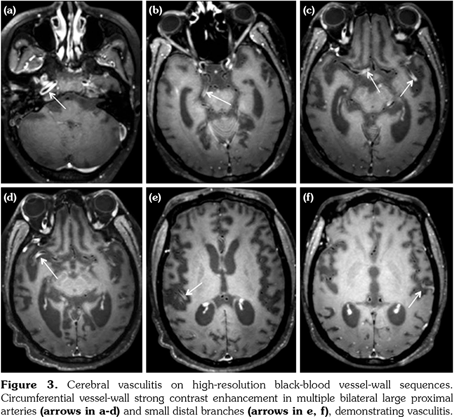 Initial brain MRI, using a standard protocol, was normal (Figures 1a and 2a). Due to rapid deterioration of the neurological status, a follow- up MRI was performed three weeks later (Figures 1b and 2b), including gadolinium administration and angiographic sequences. A mild periventricular nonspecific leukoencephalopathy and an incipient dilation of the supratentorial ventricles were observed. No abnormal contrast- enhancement was present. MRI angiography and venography showed permeability of the vessels. The patient continued to deteriorate, in a span of several weeks, despite initiating high-dose intravenous methylprednisolone. The clinical suspicion of vasculitis was raised and a third MRI was performed, at 3.5 months from the onset, with a specific protocol including vessel-wall three-dimensional (3D)-high-resolution pre- and post-contrast black-blood sequences. This MRI showed severe progression of the leukoencephalopathy, and associated atrophy with marked dilation of the ventricles and the subarachnoid spaces (Figures 1c and 2c). High-resolution vessel-wall sequences showed multiple arterial segments with concentric contrast enhancement of the wall, of proximal and distal distribution (Figure 3), compatible with vasculitis. A treatment with high-dose intravenous cyclophosphamide was started. Clinical follow- up revealed a progressive improvement of the drowsiness with eventually stabilized neurological status, but the cognitive deficit was already extremely impaired. The fourth MRI exam, at seven months from the clinical onset, showed even more severe atrophy (Figures 1d and 2d). A comparative of the hippocampal formation, crucial for the memory circuit, showed normal features on the first MRI (Figure 2e) and marked “knife blade” atrophy on the last study (Figure 2f). Concomitant diseases, including cerebrovascular and cardiovascular events, were ruled out.