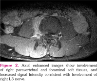 Lumbar vertebral computed tomography revealed a decrease in the right half of the disc height at the L3-4 intervertebral disc level (Figure 1a). Lumbosacral spinal magnetic resonance imaging (MRI) revealed in sagittal T2A sequences increased signal intensity, consistent with edema in the affected vertebrae and intervertebral disc (Figure 1b). The sagittal T1A sequences prior to contrast enhancement showed signal loss in the vertebral corpuses (Figure 1c), while sagittal postcontrast images showed a diffuse contrast uptake in the corresponding areas (Figure 1d). The axial postcontrast images showed involvement of the right paravertebral and foraminal soft tissues, and increased signal intensity consistent with the involvement of the right L3 nerve (Figure 2). Radiological findings were consistent with spondylodiscitis.