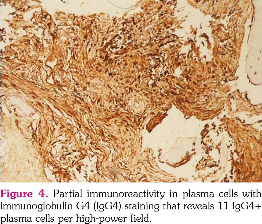 Bone biopsy was performed due to increased signal intensity and the observation of lytic and destructive lesions on lumbovertebral MRI scans. Fibrotic tissue fragments were observed among the bone spicules in tissue samples. The increased number of plasma cells in these tissue fragments was remarkable (Figure 3). Immunostaining for IgG and IgG4 showed diffuse staining for IgG, and IgG4 11/high- power field (HPF) was observed (Figure 4). Serum IgG and serum IgG4 levels were found to be elevated according to Oxford immunology data (IgG4: 336 mg/dL [10-135 mg/dL], IgG: 1656 mg/dL [600-1600 mg/dL]).