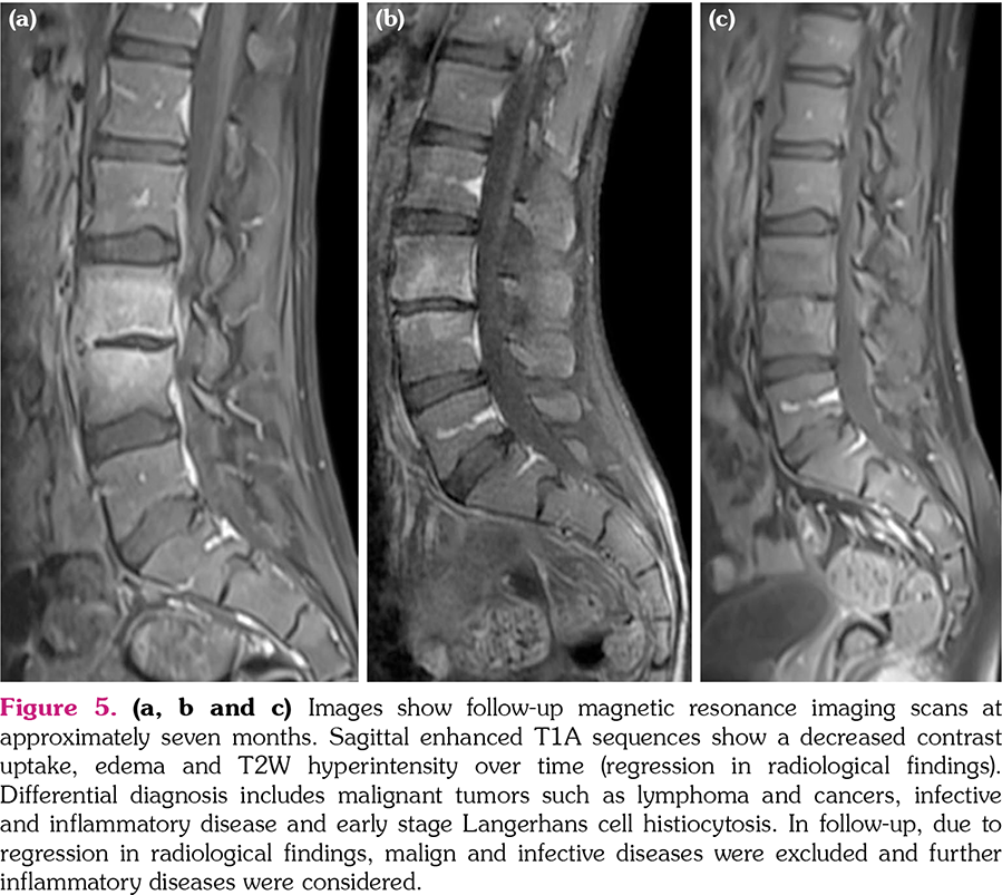 A 17-year-old Turkish male patient was admitted to our pediatric rheumatology outpatient clinic with severe lumbar pain, weight loss and fatigue for the last three months. A written informed consent was obtained from the patient's family for publication.