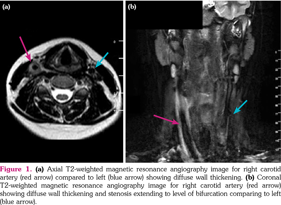 A 15-year-old girl was admitted to our clinic with dyspeptic complaints, diarrhea for two weeks, and weight loss. Her prenatal, natal, and postnatal history was uneventful. Her family history was unremarkable. Physical examination including growth parameters and pulses were in normal limits. Laboratory data revealed elevation of inflammatory markers. The upper endoscopy and colonoscopy presented multiple patchy and longitudinal mucosal aphthous ulcerations and cobblestone areas. Histopathological examination showed an increase of lamina propria cellularity, basal lymphoid aggregates, and epithelioid granuloma as well as crypt abscess formation. Clinical and histopathological findings were consistent with CD. The patient was initially treated with 2 mg/kg/day oral methylprednisolone. Azathioprine was added to corticosteroid therapy in follow-up. The corticosteroid therapy was tapered by the remission in third week. Over the course of two months, disease activity was unapparent with normal acute phase reactants. At the eighth month follow-up, acute phase indicators started to increase (erythrocyte sedimentation rate: 80 mm/hour, C-reactive protein: 92 mg/dL) in routine controls without any symptoms. All of the results were in normal ranges for the complete blood count, autoimmune markers, and endoscopic findings excluding disease activity. The patient had constitutional symptoms with unilateral neck pain with widespread sensitivity. Neck ultrasound revealed a stenosis of the right carotid artery. The magnetic resonance angiography imaging for right carotid artery showed diffuse wall thickening and 30-40% stenosis extending to the level of bifurcation (Figure 1). Clinical and laboratory features were consistent with TA. A written informed consent was obtained from the ethics committee and the parents of the patient.
