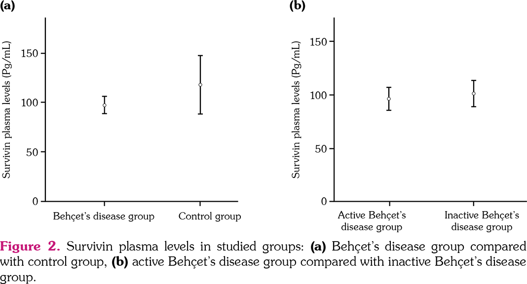 Results: Oral aphthous ulcer, genital ulcer, and skin lesions were the most common clinical manifestations in BD group. MS-PCR showed that the deoxyribonucleic acid samples of BD and control groups were not different in methylated and unmethylated areas and alleles were heterozygote. No significant difference was observed in the plasma levels of survivin in BD (98.86±25.5 pg/mL) and control (118.16±37.4 pg/mL) groups. There was no significant correlation between survivin plasma levels and BD activity.