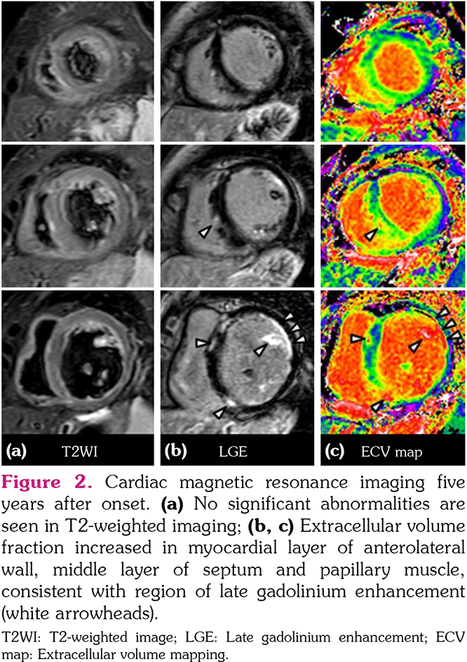 A 42-year-old female patient admitted to our hospital with muscular weakness and palpitations. Skeletal muscle biopsy reveled infiltration of lymphocytes surrounding muscle fibers consistent with the diagnosis of polymyositis (PM). Conventional cardiac angiography showed absence of macrovascular stenosis. The histopathological finding of myocardial biopsy was consistent with acute myocarditis. We performed cardiac magnetic resonance imaging (CMRI) to evaluate myocardial damage. Images were assessed for late gadolinium enhancement (LGE), T2-weighted imaging (T2WI) and extracellular volume (ECV) fraction. LGE images showed patchy enhancement in the septum and curvilinear myocardial enhancement in the inferolateral wall (Figure 1a). CMRI one year later revealed not significantly changed LGE (Figure 1b), expansion three years later (Figure 1c) and more expansion five years later (Figure 1d) without creatinine kinase elevation and cardiac symptoms. After five years, no significant abnormalities were seen in T2WI (Figure 2a). ECV fraction increased in the myocardial layer of anterolateral wall, the middle layer of septum and the papillary muscle, consistent with the region of LGE (Figure 2b, c). ECV can detect diffuse myocardial edema in areas that do not exhibit abnormalities on T2WI. Presumably, this is active inflammatory cell infiltration. Myocarditis in PM with such a unique LGE pattern is rare. There are a few reports of ECV increasing heterogeneously in PM. Cardiac involvement in PM is a frequent complication and often life-threatening.[1,2] Despite alleviating inflammation and dissipation of symptoms, asymptomatic myocardial damage progressed gradually in this case. CMRI including ECV can be a useful method of evaluating myocardial damage.