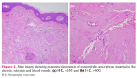 Primary localized nodular cutaneous amyloidosis (PLCNA) is the rarest form of cutaneous amyloidosis caused by immunoglobulin light-chain amyloid protein deposition in the dermis, subcutis, and blood vessels.[1] A 49-year-old Caucasian woman, affected by a form of undifferentiated connective tissue disease since the age of 22 years, presented to our clinic with a two-month history of ulcerated nodule of the scalp. Although the patient complained daily Raynaud’s phenomenon, puffy hands, xerophthalmia and xerostomia, she was not receiving any pharmacological treatment. Clinical examination revealed a 20-mm painful, ulcerated, and crusted alopecic nodule in the vertex. The nodule was orange-pink in color and firm in consistence. Two satellite lesions were noticed at the periphery. Dermoscopy revealed short ectatic vessels and shiny whitish fibrotic areas on a yellow-orange background. Histology showed an extensive deposition of eosinophilic amorphous material in the dermis, subcutis, and blood vessels. Focal areas of calcification, rare plasma cells, and neovascularization within the dermis were observed. At polarized microscope, Congo red staining revealed apple green birefringence indicating amyloid protein deposition. The patient had anemia (hemoglobin 9.9 g/dL) and mild increase of erythrocyte sedimentation rate (23 mm/h). C-reactive protein, complement (C3, C4 and CH50), and blood urea nitrogen levels were within the normal range, as well as urinalysis and 24-h urine testing for creatinine clearance and protein excretion. Serum and protein electrophoresis and urinary BenceJones protein were negative for monoclonal components. Complete metabolic panel and liver function tests were within the normal range. Serum antinuclear antibodies (ANA) were present at title of 1/1280 (centromeric pattern), as well as anti-double-stranded deoxyribonucleic acid (anti-dsDNA) (41 UI/mL). Among anti-extractable nuclear antigen, antiSSA (Ro60 and Ro52), and anti-SSB were positive, at title of 1/1375, 1/1685 and 1/154 respectively. Capillaroscopy showed elongated loops and pericapillary edema. A salivary gland biopsy excluded Sjögren syndrome and amyloidosis deposits. Calcinosis, Raynaud phenomenon, esophageal dysmotility, sclerodactyly, and telangiectasia (CREST) syndrome was also ruled out, as there was no evidence of esophageal dysmotility, sclerodactyly, and cutaneous telangiectasias. Total body computed tomography scan and laboratory results excluded systemic manifestations of amyloidosis. A concomitant diagnosis of systemic erythematosus lupus was finally made. The nodules were treated with electrodessication and cryosurgery; however, four months later, the primary lesion relapsed. The patient underwent radical surgical excision and full-thickness skin graft. Meanwhile, she was treated with hydroxychloroquine 200 mg twice/day and a four-month systemic corticosteroid course (prednisone 1 mg/kg/day). No clinical and dermoscopic relapse was detectable at two years of follow-up, after a maintenance treatment with hydroxychloroquine 200 mg a day. A written informed consent was obtained from the patient.