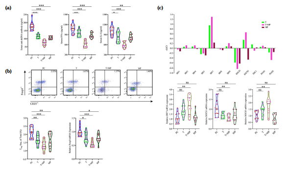 Tofacitinib decreased the percentages of splenic Treg cells in lupus mice. The percentages of splenic Treg cells in lupus mice increased significantly in PC (Figure 1f) and decreased in the treatment groups after therapy. The most evident change was observed in T+MP, and the level of Foxp3 mRNA exhibited a similar tendency (Figure 4b).