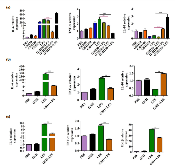 However, we observed a higher level of IL-6 expression in LPS+GSH150 than that in LPS+GSH100. Meanwhile, we detected a higher IL-10 mRNA with LPS+GSH150 than with LPS+GSH100. This may result from the fact that GSH150 may pose a higher pressure to the SFs which, in turn, promotes both pro-inflammatory and anti-inflammatory cytokine expression. However, GSH100 cannot only downregulate TNF-α and IL-6 expression, but also upregulate IL-10 expression, showing a strong anti-inflammatory effect. Therefore, in the present study, we used 100 µg/mL GSH to study the anti-inflammatory effect and underlying mechanism.