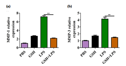 To measure the effects of GSH on MMPs in SFs, RT-qPCR was used to examine the expression of MMPs in MH7A. As presented in Figure 3, the expression levels of MMP-1 and MMP-3 were significantly downregulated in the LPS+GSH group compared to the LPS group (p<0.01).