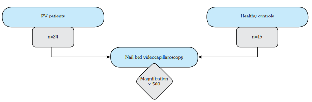 Patients and Methods: This cross-sectional study included a total of 24 patients (19 males, 5 females; mean age: 59.8±12.9 years; range, 50.2 to 68 years) who were diagnosed with PV and 15 healthy controls (11 males, 4 females; mean age: 40.7±5.1 years; range, 36 to 44 years) between June 2016 and February 2017. Nailfold video capillaroscopy was performed by an experienced rheumatologist who was blinded to clinical data. The apical, arterial, and venous limb diameters of capillaries were measured and microvascular changes of capillaries were scored.