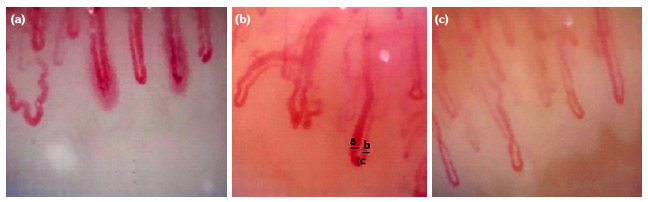 Diameters of capillary, apical, arterial, and venous legs were measured (Figure 2), the presence of giant, ectatic capillary, bleeding areas, avascular areas, and neo-angiogenesis together with the brushy, curved, cross-linked, thin-long capillary shapes were evaluated as described previously in the literature.[12]