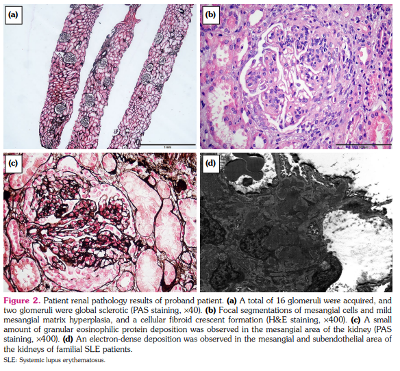 The baseline characteristics of the four family members, including the patient’s mother (Ia, mother), IIa (eldest daughter), IIb (middle daughter), and IIc (youngest daughter), are listed in Table 1 and Figure 1a. The proband patient (IIa, eldest daughter) was a 26-year-old woman who visited our department and reported a history of SLE. The mother and three daughters were all diagnosed with SLE according to the European League Against Rheumatism (EULAR) SLE 2012 criteria.[17] The patient and her mother had lupus nephritis. Patient’s mother and she had mild hypertension. The proteinuria in the mother was nephritic proteinuria, while the proband patient showed nephrotic proteinuria. The patients all showed a mild decrease in estimated glomerular filtration rate (eGFR) and low serum albumin levels. Our laboratory findings showed that all four patients were positive for the anti-SSA and anti-nuclear (ANA) antibodies, but the titers of ANA varied among the four patients. All patients showed hypocomplementemia, with titers of the ANA and anti-SSA antibodies (+++). One of the patient’s sisters showed anti-double-stranded DNA (dsDNA) positivity, while the other three patients were negative for this phenotype. The Systemic Lupus Erythematosus Disease Activity Index (SLEDAI) score was calculated based on symptoms. Renal biopsy showed that the proband patient had lupus nephritis IV according to the 2003 International Society of Nephrology (ISN)/ Renal Pathology Society (RPS) Classification of lupus nephritis (LN) (Figure 2).[18]