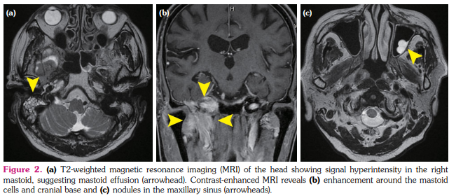 An 80-year-old man with a history of diffuse large B-cell lymphoma (DLBCL) presented to the otolaryngology department due to hearing loss and fullness in the right ear. He was diagnosed with primary testicular DLBCL five years earlier, but complete remission was sustained after treatment. Computed tomography identified a soft-tissue mass in the right middle ear and mastoid cells, along with destruction of the petrous and sphenoid bones with soft-tissue mass and mucosal thickening in the maxillary sinus (Figure 1a-c). A weakly positive result was obtained for serum proteinase 3-anti-neutrophil cytoplasmic antibody (PR3-ANCA), at 5.2 IU/mL. The patient was referred to our department on suspicion of granulomatosis with polyangiitis (GPA) and otitis media with ANCA-associated vasculitis (OMAAV). He showed no other symptoms suggestive of systemic vasculitis, and serum soluble interleukin-2 receptor was slightly elevated to 643 U/mL (normal: <610 U/mL). The T2-weighted magnetic resonance imaging (MRI) showed signal hyperintensity in the right mastoid, suggesting mastoid effusion (Figure 2a). However, contrast-enhanced MRI revealed enhancement around the mastoid cells and cranial base and nodules in the maxillary sinus (Figure 2b, c). Diffuse large B-cell lymphoma was diagnosed from biopsied mucosa in the maxillary sinus, with no findings of granuloma or vasculitis.