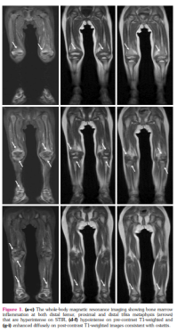 The sister of Patient 1 who was 18 months old presented to our department with recurrent joint and bone pain, fatigue, and anemia during the last six months. There were no skin findings. Physical examination was unremarkable. The APRs were elevated at the time of admission (ESR 120 mm/h and CRP 14 mg/dL). Severe neutropenia (600/mm3) with normal WBC count, microcytic anemia (hemoglobin 8.6 mg/dL), and thrombocytosis (700x103/mm3) were detected. The bone marrow assessment revealed a normocellular bone marrow with megaloblastic changes. The WBMSS-MRI demonstrated osteitis at the distal femur, proximal, and distal tibia, bilaterally (Figure 1).