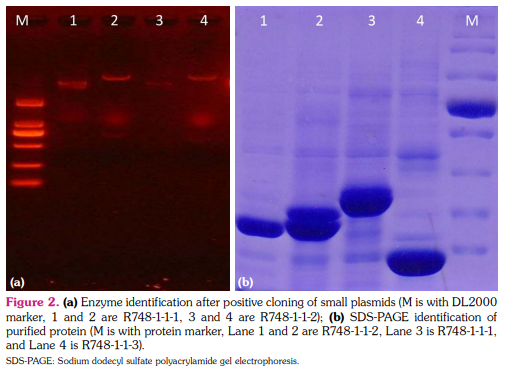 Preparation of anti-RANKL monoclonal antibodies: Figure 2a showed that R748-1-1-1 (Lane 1) and R748-1-1-2 (Lane 2) anti-RANKL monoclonal antibodies had more colony PCR products, and after Ni-NTF purification, R748-1-1-3 was defeated (Figure 2b). Table 1 shows that the R748-1-1-1 antigen molecular weight is 31.73 kDa with 68% purity and R748-1-1-2 antigen molecular weight is 28.1 kDa with 54% purity.