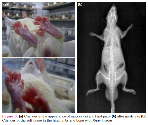 Experimental protocols: Vernier caliper was used to measure the thickness of the fleshy joints of the toe joints of rats.[16] X-ray radiography was used to observe the change of foot joint rats before and after molding, respectively, under the condition of 60kV, 8mA and 0.05s. After anesthesia through intraperitoneal injection of 20% chloral hydrate (400 mg/kg), blood was obtained from aorta abdominal, and the foot joint tissue was dissected. The proximal toe and metatarsal joint were fixed in 20% formaldehyde solution for three days and, then, placed in 5% ethylenediaminetetraacetic acid (EDTA) liquid to decalcify for 50 days (liquid was changed every five days). Furthermore, after paraffin embedding, slicing and hematoxylin-eosin (HE) staining, the samples were observed under microscope (Olympus, Tokyo, Japan).