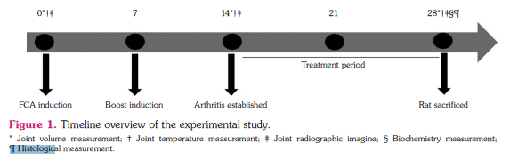 In this study, the rats were injected with 0.1 mL of FCA (Sigma Chemicals, St. Louis, MO, USA), containing 10 mg of heat-killed Mycobacterium tuberculosis per mL of paraffin oil, mixed with sterile saline in the ratio of 1:1 into the right knee joint. To increase the severity of arthritis, a booster injection with 0.1 mL of the emulsion was administered in the same manner on Day 7.[22,23] Figure 1 depicts the critical event linked with the FCA-induced arthritis model in further detail.