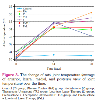 In conclusion, thermal imaging and radiographic examination can give results consistent with the severity of the disease. However, thermal imaging can be ineffective for follow-up thermal application. Although either LLLT or TU have positive effects on RA, a more effective result obtained from the use of LLLT and TU combination with intra-articular P. Also, LLLT and TU may become a better therapeutic opportunity for the treatment of RA. However, further studies are needed to investigate the effects of using various doses of LLLT and TU in rat models of RA.