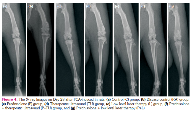 Materials and methods: A total of 56 adult male Wistar rats were divided into seven groups: control (C), disease control (RA), P, TU, LLLT (L), P + TU (P+TU), P + LLLT (P+L) groups. The skin temperature, radiography, joint volume, serum rheumatoid factor (RF), interleukin (IL)-1β, serum tumor necrosis factor-alpha (TNF-α), and histopathological evaluation of joint were performed.