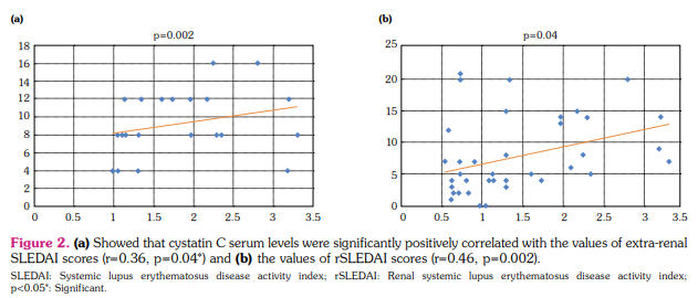 Results: JSLE patients had significantly elevated mean sCyc C and sβ2M levels (1.4±0.8 mg/mL and 2.8±0.9 mg/mL, respectively) compared to the controls (0.6±0.1 mg/mL and 2.0±0.2 mg/mL, respectively; p<0.00). The mean sCys C and sβ2M levels were significantly higher in the LN group, compared to non-LN patients (1.8±0.7 mg/mL and 3.1±1.0 mg/mL, respectively vs. 0.8±0.3 mg/mL and 2.4±0.6 mg/mL, respectively; p=0.002 and p=0.02, respectively). The sCys C levels had significant positive correlations with erythrocyte sedimentation rate (r=0.3, p=0.05), serum creatinine (r=0.41, p= 0.007), 24-h urinary protein (r=0.58, p<0.001), anti-double stranded deoxyribonucleic acid antibodies titers (r=0.55, p=0.002), extra-renal SLEDAI scores (r=0.36, p=0.04), rSLEDAI (r=0.46, p=0.002), and renal class (r=0.7, p=0.0001). Serum β2M levels were significantly negatively correlated with complement 4 levels (r=-0.31, p=0.04) and significantly positively correlated with extra-renal SLEDAI scores (r=0.3, p=0.05).
