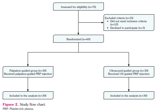 The diagnosis was confirmed by a physician who also performed the inclusion, randomization, and treatment procedures. Another blind physician was responsible for outcome evaluations at one, three, and six months. The patients were randomly assigned by a computer-generated randomization program into two groups including the palpation-guided (n=30) and US-guided injection (n=30) group.