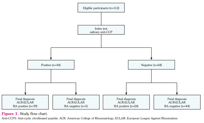 Patients and methods: Between June 2017 and April 2019, a total of 63 patients with rheumatoid arthritis (10 males, 53 females; mean age: 50.4±9.5 years; range, 27 to 74 years) and 49 healthy controls (8 males, 41 females; mean age: 49.3±9.3 years; range 27 to 67 years) were included. Salivary samples were collected by passive drooling. Anti-cyclic citrullinated peptide analyses of salivary and serum samples were performed.