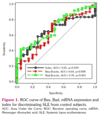 Statistical analysis was performed using the Minitab for Windows version 17.1.0.0 (Minitab Inc., 2013, PA, USA). The normality of the data was examined using the ShapiroWilk test. Continuous data were presented in mean ± standard deviation (SD) or median (interquartile range [IQR]), while categorical data were presented in number and frequency. Comparison between two groups of continuous data was performed using the independent t-test or Mann-Whitney U test, for parametric and non-parametric variables, respectively, and one-way analysis of variance (ANOVA) for comparison between more than two groups with the Tukey methods as post-hoc test. The accuracy of Bax/β-actin and Bad/β-actin mRNA expression for predicting SLE and SLE flare-up were assessed using the receiver operating curve (ROC) analysis; assuming that the area under the ROC curve (AUC)= 0.6 was significant with a margin of type 1 error 0.05 and type 2 error 0.2. Probability of SLE flare-up was evaluated using logistic regression models. A two-sided p value of <0.05 was considered statistically significant.