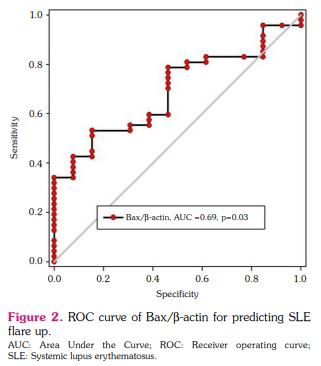 Results: The expression of Bax and Bad was significantly lower in SLE group than the control group. The median value of mRNA expression of Bax and Bad was 0.72 and 0.84, respectively versus 0.76 and 0.89 in the control group. The median value of (Bax*Bad)/β-actin index was 17.8 in the SLE group and 19.64 in the control group. The expression of both Bax, Bad and (Bax*Bad)/β-actin index had a good significant diagnostic utility (area under the curve [AUC]= 0.64, 0.70, and 0.65, respectively). The Bax mRNA expression showed a significant upregulation with disease flare-up. The efficacy of Bax mRNA expression in predicting SLE flare-up was good (AUC= 73%). In the regression model, the probability of flare-up reached 100%, with increasing Bax/β-actin as well, and the likelihood of flare-up increased 10,314 times with every unit increase of Bax/β-actin mRNA expression.