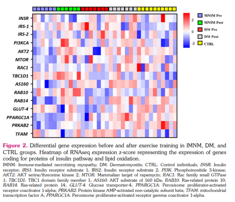 Besides the decreased skeletal muscle fat infiltration, we also observed, in the present study, an increase in several genes associated with insulin signaling in the DM group (e.g., AMPKβ, AS160, INSR, PI3K, and RAB14) and IMNM group (e.g., AMPKβ2, AKT2, RAB10, and RAB14) after completion of the exercise training program. Furthermore, as commented earlier, genes related to skeletal muscle fat oxidation (AMPKβ2 and PGC1-α) were increased in both DM and IMNM group. This data corroborated to the improvement in insulin sensitivity and lipid oxidation found in the present and previous[15] study.