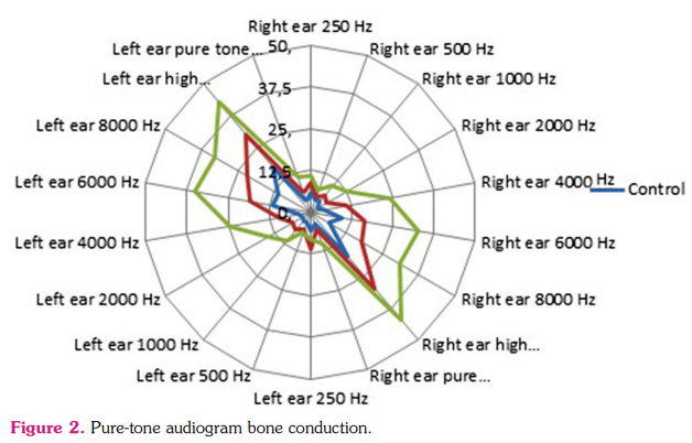 All audiometric results are summarized in Tables 4 to 7 and illustrated in Figures 1 and 2. Values of audiometric tests yielded significant differences between the control and R-AxSpA group and also the control and NR-AxSpA group. For the air conduction studies, the statistical significance began at 1000 Hz in the R-AxSpA group. It was found that in the NR-AxSpA group, the statistical difference started in higher frequencies. The bone conduction audiometric studies were similar to air conduction studies. The statistical significance was found in 1000 Hz and higher frequencies in the R-AxSpA group and 2000 Hz and higher frequencies in the NR-AxSpA group.