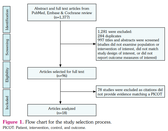 By using a search strategy, 1,377 possibly relevant studies were found during the research selection phase. By screening the titles and abstracts, 1,281 were ruled out (duplicate studies, studies that did not match the study design of interest, studies that did not examine the patient of interest or did not report the outcome measures of interest). As a result, 18 studies that were relevant were included in the complete article review (Figure 1). To establish the degree of evidence in each area, the OCEBM approach was utilized (Table 1).