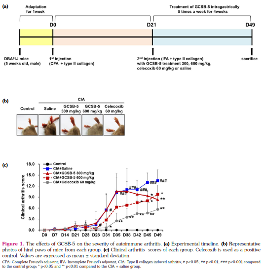Herein, we evaluated the effects of GCSB-5 on the severity of inflammatory arthritis and pain perception in a murine model of RA. The impact of GCSB-5 on pain-related receptors was also investigated, and its underlying mechanism was explored. To the best of our knowledge, this is the first study to reveal the effects of GCSB-5 in RA.