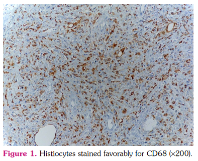 A 40-year-old female presented to the emergency department with severe bone pain, numbness in the left leg, muscular weakness, and pain in the right gluteal region. Psoriatic arthritis (PsA) with skin and nail psoriasis, distal and proximal interphalangeal arthritis, dactylitis, and sacroiliitis was diagnosed 14 years ago. The patient was undergoing etanercept treatment for PsA. Multiple imaging procedures were conducted on the patient. Computed tomography revealed multiple abscesses in the bilateral lumbar and gluteal regions, pleural effusion and nodules in the thorax, increased sclerosis in the sacroiliac joint, sacral wing, and both femoral head-neck junctions, and osteosclerosis areas in the right tibia metaphysis diaphysis. A muscle biopsy revealed the presence of infiltrating ECD. In the biopsy, there was an intense infiltration of histiocytes that stained positively for CD68 but negatively for S100 and CD1a (Figure 1). The patient did not possess a BRAF mutation. Etanercept was stopped, and six cycles of peginterferon alfa-2a were administered by the hematology clinic. The patient's C-reactive protein (CRP) levels returned to normal after receiving the medication, and clinical remission was achieved.