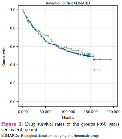 Results: The mean age of the elderly patients was 67±5.8 years, while the mean age of the younger patients was 49.2±10.9 years. Male predominance was lower in the older AS group compared to the younger AS group (p=0.002). During follow-up period, 397 patients (comprising 318 young and 79 elderly individuals) had a history of using at least one biological disease-modifying agent (bDMARD). There was no significant difference between the groups in terms of DMARD and bDMARD-use distributions. First tumor necrosis factor inhibitor (TNFi) retention rates were found to be similar in both groups over 10 years of follow-up. Adverse events were found to be similar in young (19.9%) and elderly (26.8%) AS patients.