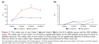 The outlier rates of over Grade 1 and Grade 2 for the IL-6 inhibitor group and the JAK inhibitor group are shown in Figure 3. The outlier rate of over Grade 1 for the JAK inhibitor group increased significantly from 4.2% at 0 weeks to 18.1% at four weeks (p=0.012), and it remained higher at 12 weeks (21.7%) and 24 weeks (18.3%) than at 0 weeks (p=0.002 and p=0.015, respectively). On the other hand, the outlier rate of over Grade 1 for the IL-6 inhibitor group was not significantly increased at four (9.2%), 12 (8.6%), and 24 (58.5%) weeks compared to 0 weeks (5.6%; p=0.519, p=0.532, and p=0.745, respectively). The outlier rate of over Grade 1 at 12 weeks was significantly higher in the JAK inhibitor group than in the IL-6 inhibitor group (Figure 3a). The outlier rates of over Grade 2 in both groups were not significantly different at all time points (Figure 3b).