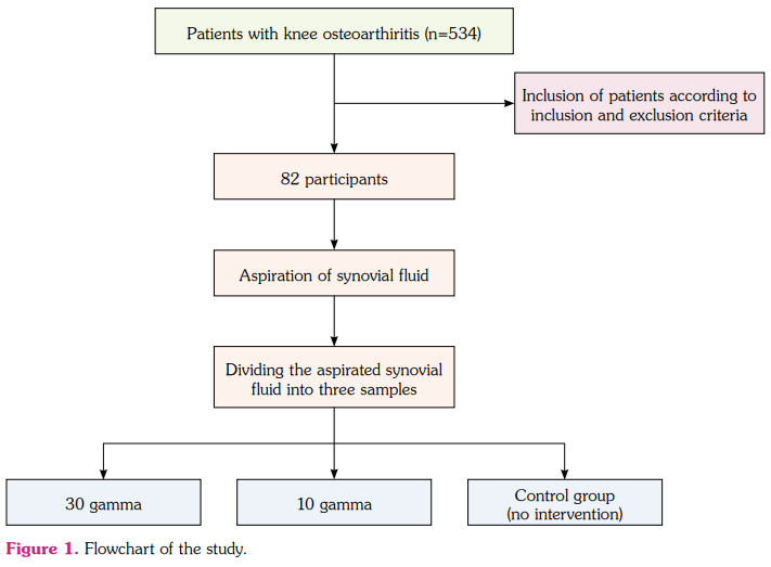This controlled clinical trial, in concordance with the previous literature,[10] was conducted with 82 individuals (61 females, 21 males; mean age: 63.1±10.0 years; range, 40 to 73 years) with confirmed knee OA (Kellgren-Lawrence Grade 2 or 3) based on American College of Rheumatology criteria at the University of Health Sciences, Sultan 2. Abdulhamid Han Training and Research Hospital, Department of Physical Medicine and Rehabilitation between 21 April 2023 and 20 May 2023. Participants who experienced persistent knee pain (Visual Analog Scale pain score ≥4) for at least six months due to OA, had joint effusion on the affected knee, and were willing and able to comply with the study protocol, including follow-up appointments and procedures were included in the study. Based on the previous works in the literature,[11] participants with a history of ozone therapy sensitivity, knee infections in the past six months, recent knee surgeries or joint injections within three months, pregnancy or breastfeeding, and those with other chronic inflammatory joint conditions, autoimmune disorders, concurrent use of interfering medications, or any conditions compromising safety, compliance, or study validity were excluded. Randomization procedures were not employed, as the synovial fluid samples aspirated from each of the enrolled patients were divided into three distinct groups according to the ozone dose (0, 10, and 30 γ), with each group being allocated a portion of the samples. The flowchart of the study is presented in Figure 1.