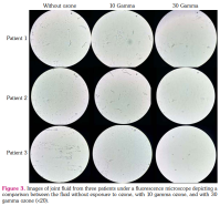 Before conducting the biochemical analyses, synovial fluid samples (approximately 2 mL) were transferred to Eppendorf tubes and centrifuged at 1000 g for 5 min using the Beckman Coulter Allegra centrifuge. The supernatants were discarded, and 100 μL of the pellet was extracted and placed onto a slide. The slides were examined under a fluorescence microscope Eclipse Ts2 (Nikon, Tokyo, Japan) to obtain ×20 magnification images (Figure 3).