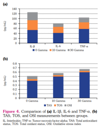 Statistically significant differences were observed in the measurements of TAS, OSI, IL-1β, IL-6, and TNF-α (p<0.05) (Table 3). The OSI, IL-1β, IL-6, and TNF-α measurements were lower at 10 γ than those at 0 γ and lower at 30 &gamma than those at 10 γ. In vitro ozone injection at 30 γ was more effective in reducing the proinflammatory cytokine levels in the synovial fluid than that at 10 γ and 0 γ (p<0.05) (Figure 4).