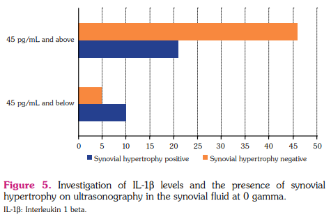 When examining the presence of synovial hypertrophy on ultrasound and the IL-1β level in the synovial fluid (Table 2), a significant difference was observed (p<0.05). When synovial hypertrophy was positive, the IL-1β level in synovial fluid was significantly higher (90.2%) (Figure 5).