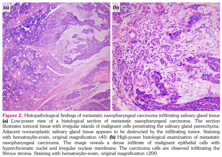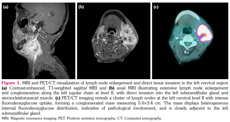 Upon admission, laboratory analyses revealed anemia, indicated by a hemoglobin concentration of 10.8 g/dL, and raised C-reactive protein levels, which were measured at 54.05 mg/L. A computed tomography scan indicated necrotic lymph nodes, leading to a diagnosis of metastatic carcinoma confirmed by fine-needle aspiration. Subsequent magnetic resonance imaging (MRI) and positron emission tomography (PET)/computed tomography (CT) confirmed the presence of left hypopharyngeal cancer with ipsilateral lymph node metastasis involving the left submandibular gland and sternocleidomastoid muscle (5.2×4.8 cm; Figures 1a-c). Following radical neck dissection, squamous cell carcinoma with metastasis, including invasion into the submandibular gland was confirmed (Figures 2a, b). The patient was diagnosed with Stage IVA hypopharyngeal cancer and underwent three months of cisplatin and radiation therapy. However, restaging after treatment revealed a new nasopharyngeal mass with skull base destruction and lung metastasis. Despite undergoing an additional five months of chemotherapy, treatment was discontinued due to his deteriorating condition. Subsequently, the patient received four months of symptomatic conservative care before being lost to follow-up.