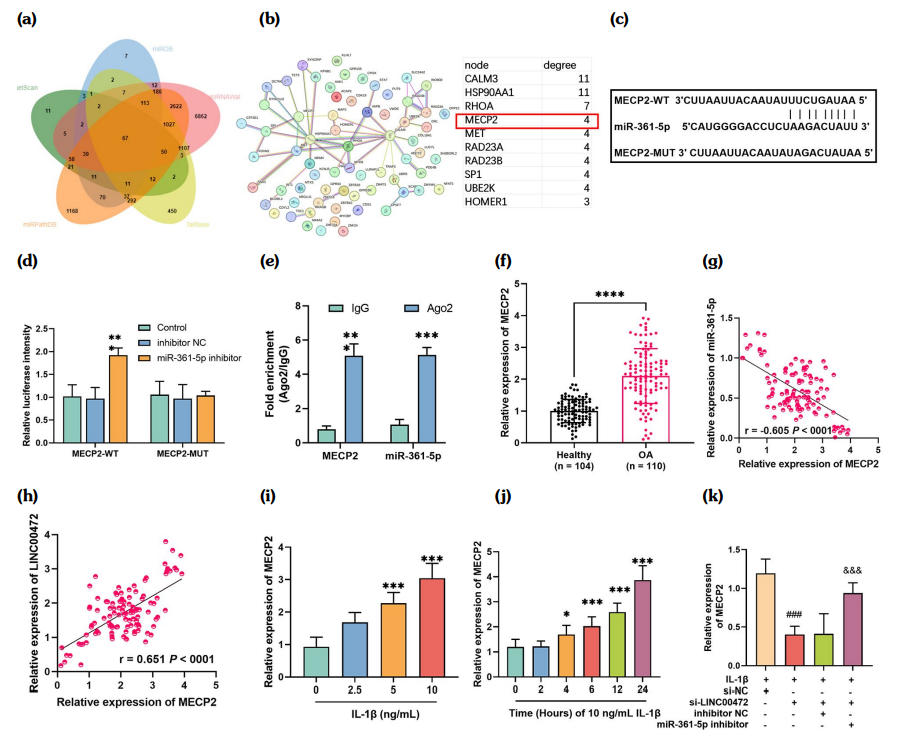 The targets of miR-361-5p were predicted in miRDB, miRWalk, Tarbase, miRPathDB, and TargetScan online software. It found a total of 67 overlapping targets (Figure 6a). The PPI network contained 67 nodes and 54 edges, and the PPI enrichment p-value was 0.0051. The top 10 genes in the PPI network for degree nodes included MECP2 (Figure 6b). As shown in Figure 6c, complementary sites existed between miR-361-5p and MECP2. After transfection with miR-361-5p inhibitor, the luciferase activity of MECP2-WT was increased (Figure 6d). Both miR-361-5p and MECP2 could be enriched in Ago2 (Figure 6e). Compared to healthy subjects, MECP2 levels in OA patients were highly expressed (Figure 6f), and MECP2 levels were negatively or positively correlated with miR361-5p or LINC00472 levels (Figures 6g, h). In addition, IL-1β significantly affected the level of MECP2, and with the increase of IL-1β concentration and the passage of treatment time, the level of MECP2 showed a dose-dependent increase (Figures 6i, j). Finally, we found that after the downregulation of LINC00472, MECP2 levels decreased; however, this result was reversed by the addition of miR-361-5p inhibitor (Figure 6k).
