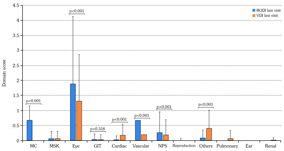 To determine the organ systems that were best represented in BODI, the scores of the different domains of BODI at the last visit were compared with the corresponding ones of VDI. BODI had significantly higher scores for the mucocutaneous, ocular, neurological, and vascular domains than VDI (Figure 3).